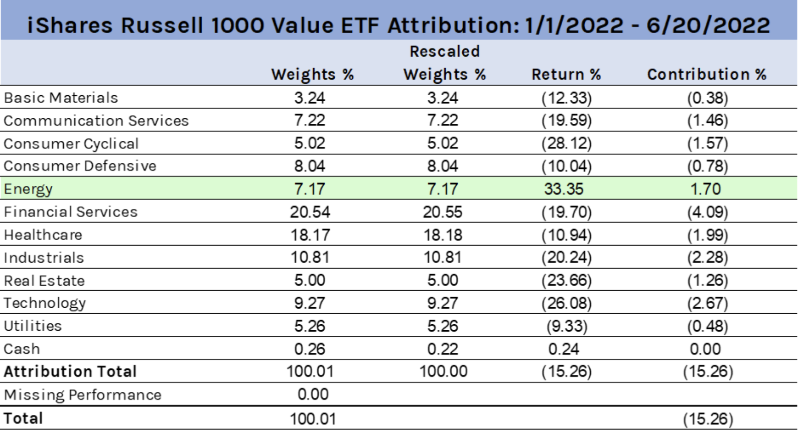 This sector attribution report for the iShares Russell 1000 Value Index ETF (IWD) covers January 1 – June 20, 2022. The Russell 1000 Value Index measures the performance of the large-cap value segment of the US equity universe, including companies with lower price-to-book ratios and lower expected and historical growth rates (source: Vanguard).